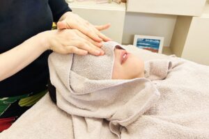 ゆったりとした座り心地の良いリクライニングチェアに座ってはじめていきます。