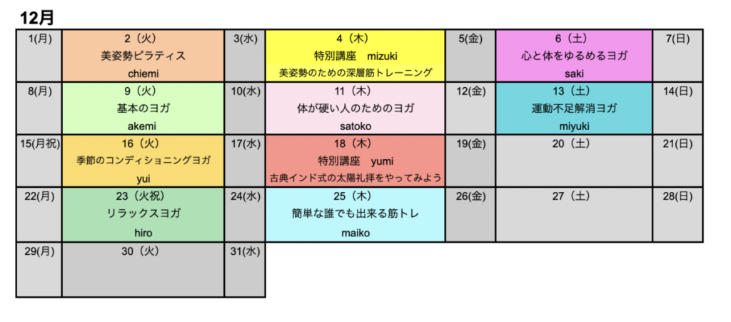・12月→「美姿勢のための深層筋トレーニング」mizuki、「古典インド式の太陽礼拝をやってみよう」yumi